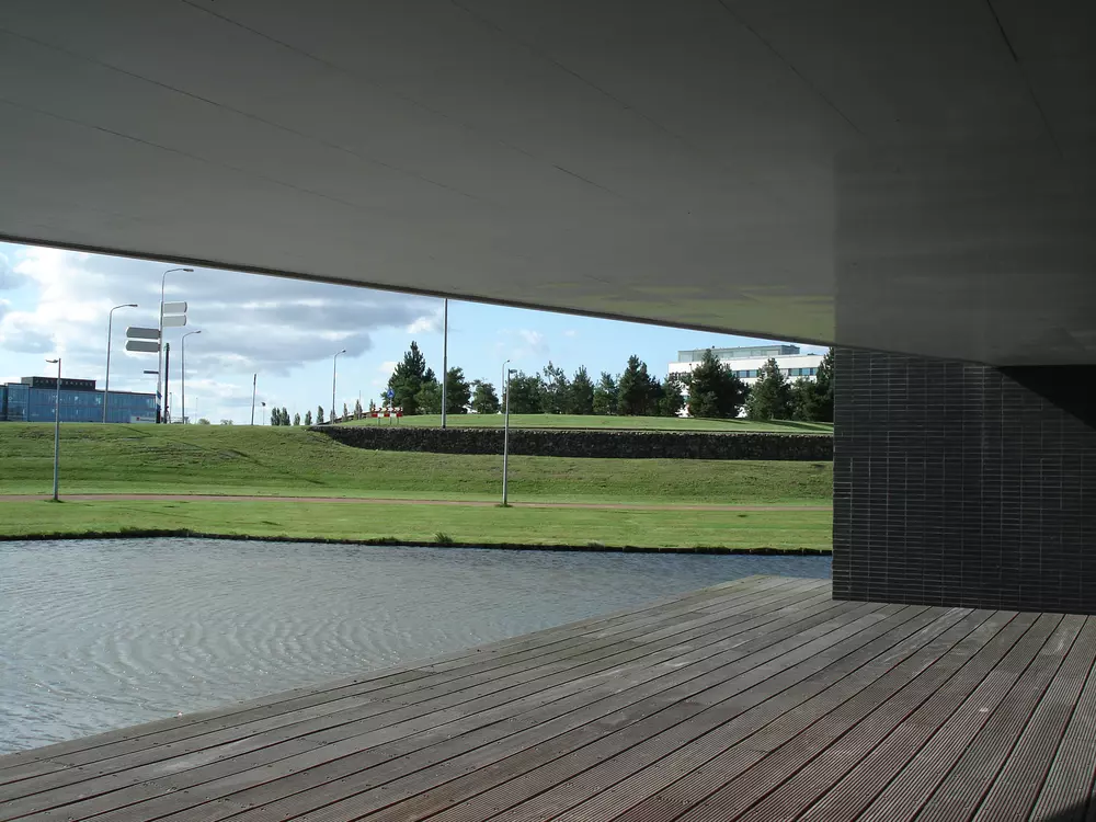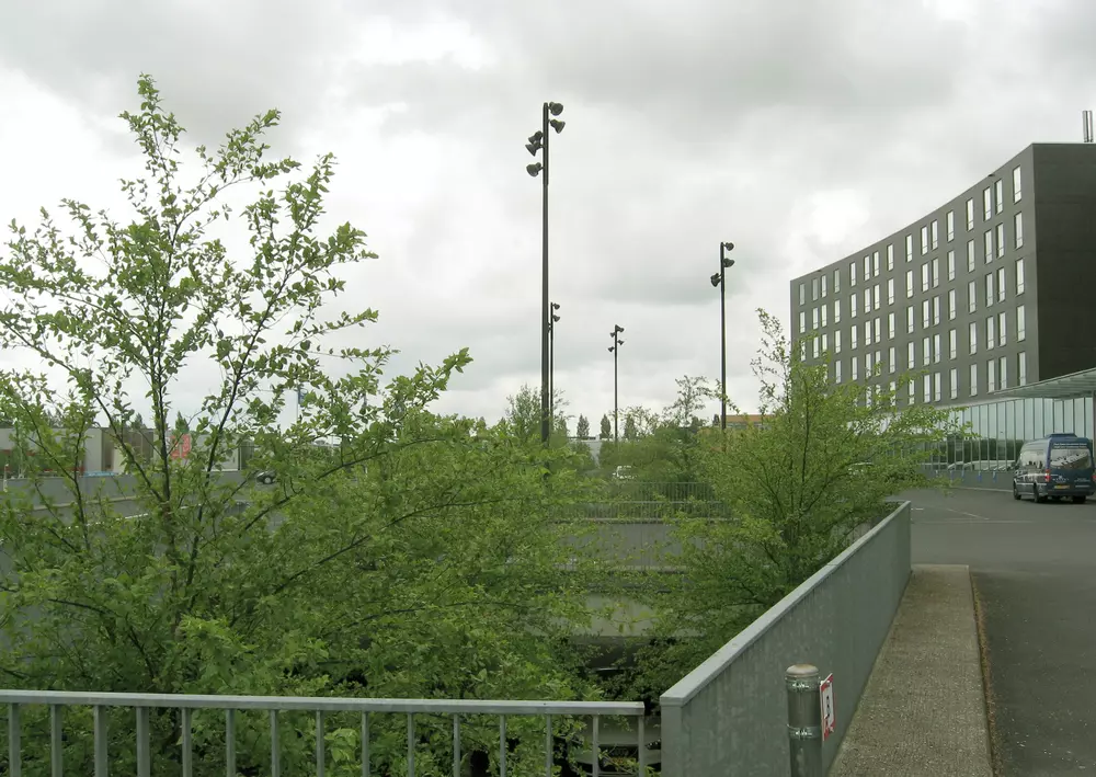 In het zwart afgewerkte dek zijn grote gaten aangebracht, omkaderd door brede lichtgrijze betonbanden. Ter plekke van de gaten zijn op de begane grond zoveel mogelijk berken geplant. De kruinen van de bomen steken door het dek en worden 's avonds van onder blauw aangelicht. Vijf hoge lichtmasten verlichten het bovendek.