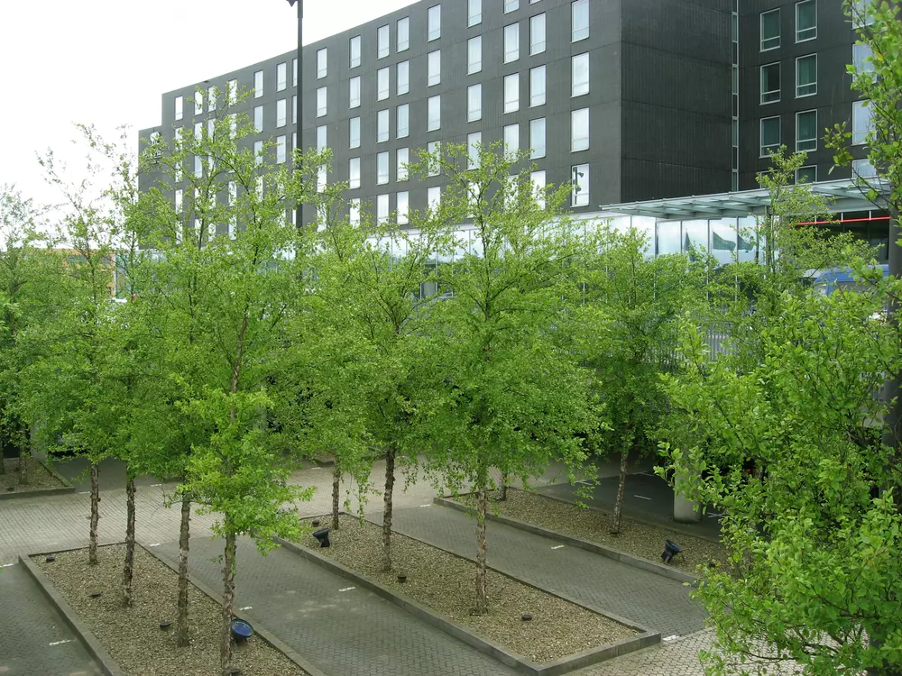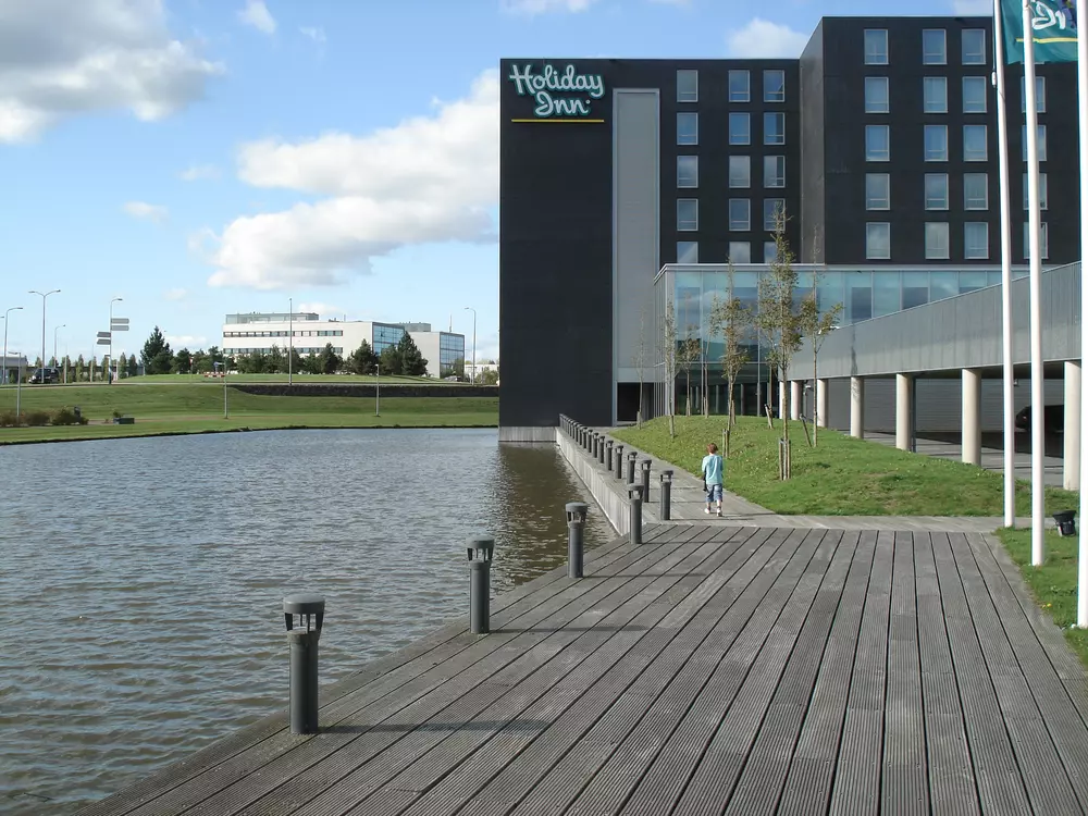 De kavel wordt omringd door grastaluds met bomen, zoals dat ook bij de andere kavels op het Airport Business Park Lijnden het geval is. Een vlonder vormt de overgang tussen het hotel en de centrale waterpartij van het bedrijfspark.