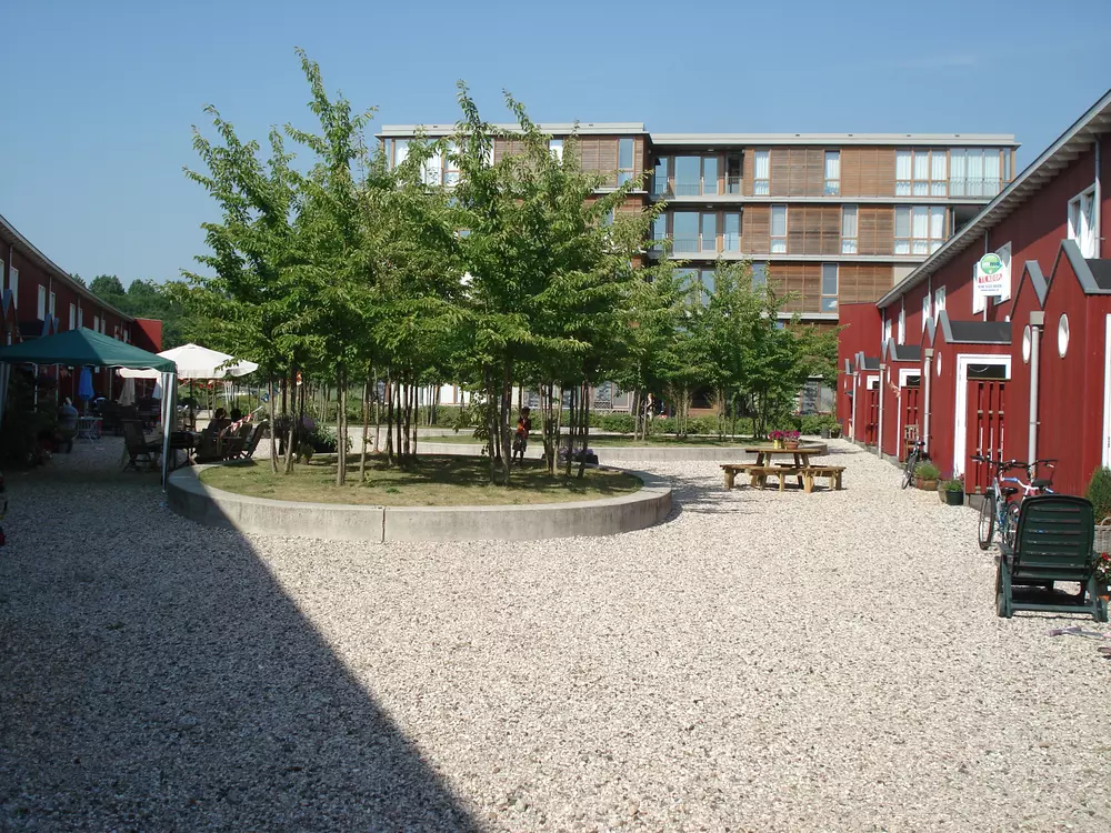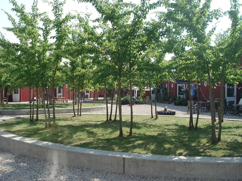 De binnenplaats bestaat uit een licht schelpenplein met groene, verhoogde eilanden. Deze eilanden zijn beplant met kersenbomen, die in het voorjaar veranderen in bloeiende wolken. De verhoogde randen doen dienst als zitplek, terwijl kinderen vrij kunnen spelen, rennen en fietsen tussen het groen. Iedere woning beschikt over een eigen houten terras aan het binnenplein, waardoor privé en collectief op een vanzelfsprekende manier samenkomen.