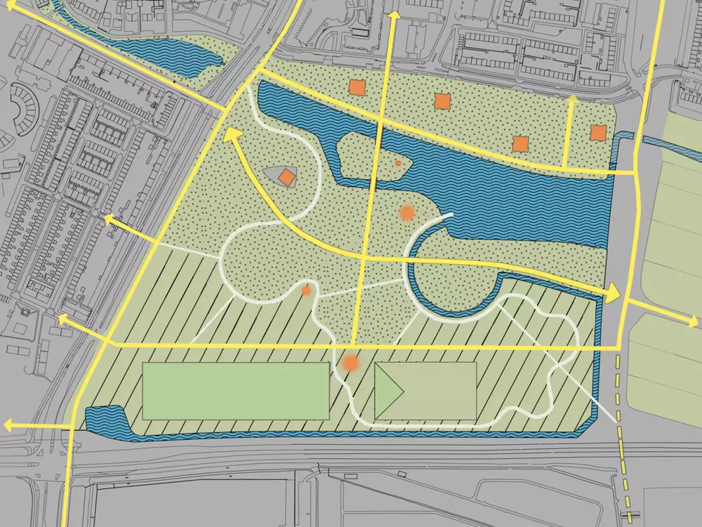 De Fuikvaart wordt vergroot tot een centrale vijver en het reliëf loopt glooiend op richting de Schipholweg, waardoor er een geluidswal voor de snelweg ontstaat.