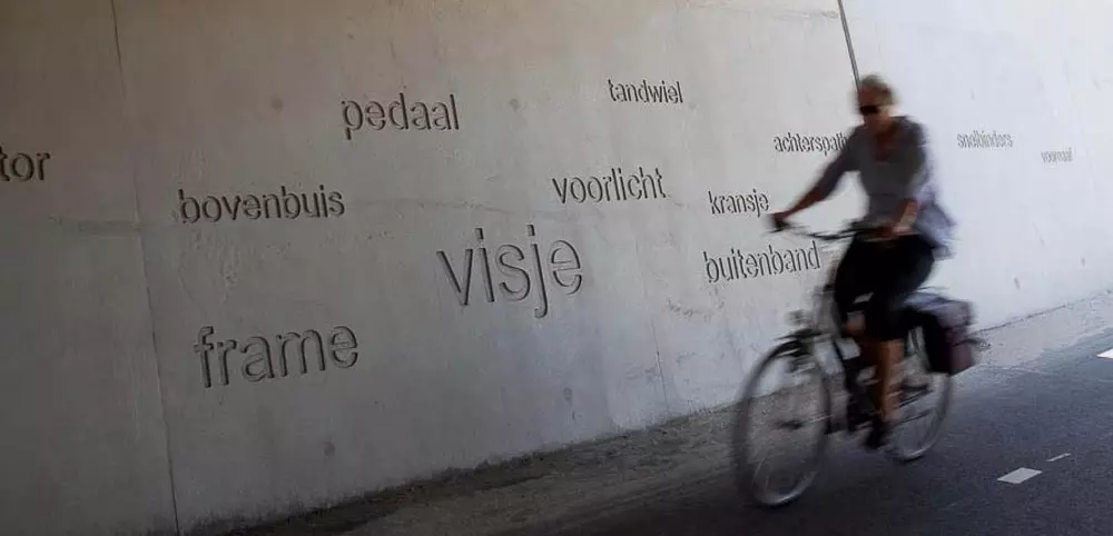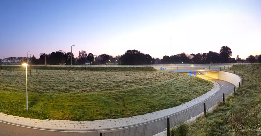 Om een zo ruim en licht mogelijke fiets- en voetgangersonderdoorgang onder de snelweg te creëren, is de noordwand van de toeritten als een flauw oplopend grastalud uitgevoerd. De tunnelwand helt aan de zuidkant 15 graden naar achter en het wordt aan de noordzijde als een ronde wand uitgevoerd. Om de beleving van het fietsen te versterken zijn in de tunnel alle onderdelen waaruit een fiets is opgebouwd in woorden uitgedrukt en in de muur gegoten.