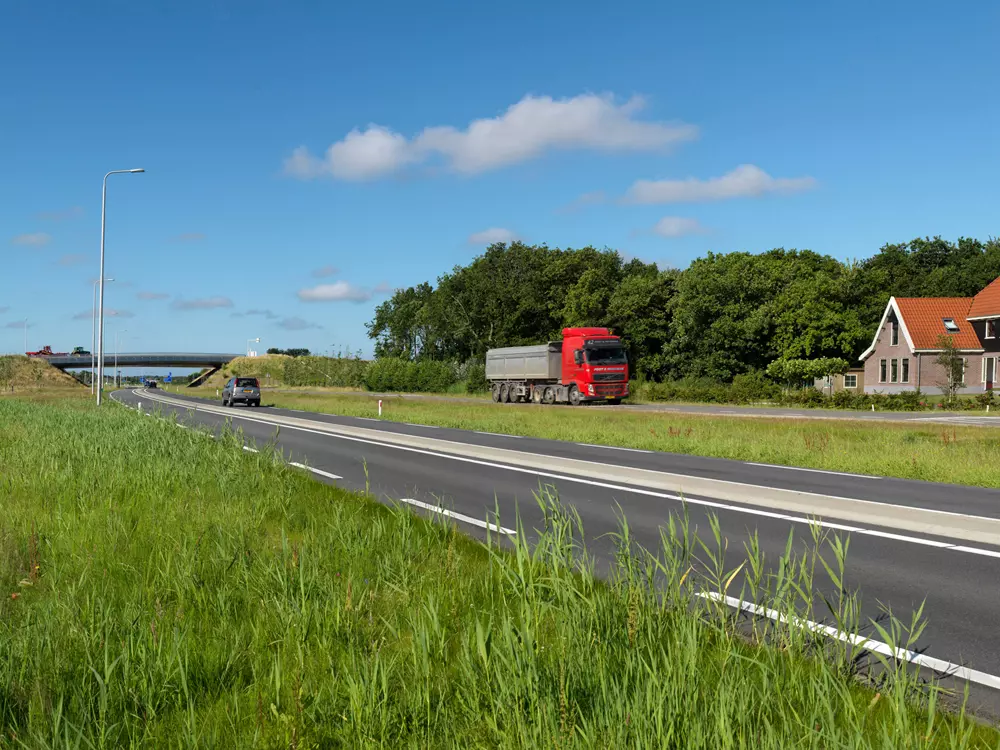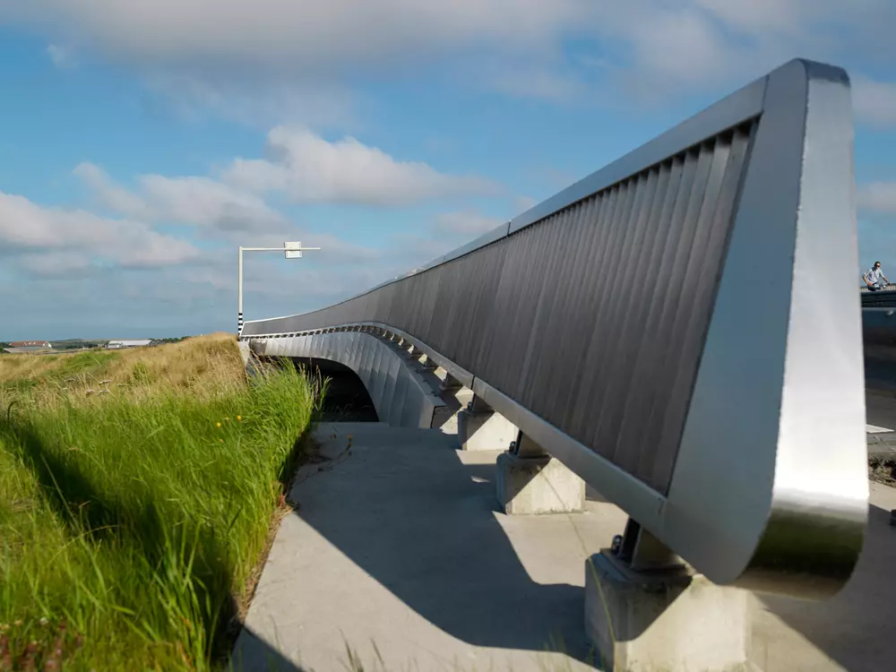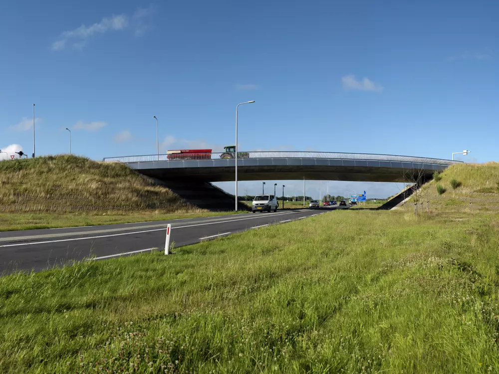 Als onderdeel van de omlegging van de N9 heeft VEVAP twee slanke en transparante viaducten ontworpen en een fietstunnel. De viaducten maken gebruik van basalt, beton en geborsteld RVS, passend bij het lokale kustlandschap en klimaat. Het ontwerp volgt het principe van windgeveegde vormen, zichtbaar in de brughoofden, brugdek en leuningen. De viaducten zijn hoog gefundeerd en de leuningen zijn ontworpen voor maximaal doorzicht, met dunne lamellen die visuele verstoringen minimaliseren. De omliggende landschappen bevatten brede grasbermen, waterpartijen en beplanting die aansluiten bij de polderomgeving en zorgen voor een subtiele integratie van de viaducten. De waterpartijen dienen tevens als waterberging en versterken het atmosferische karakter van het landschap rond de N9.