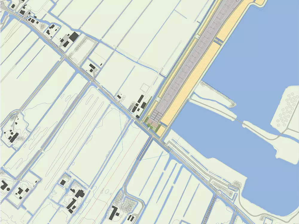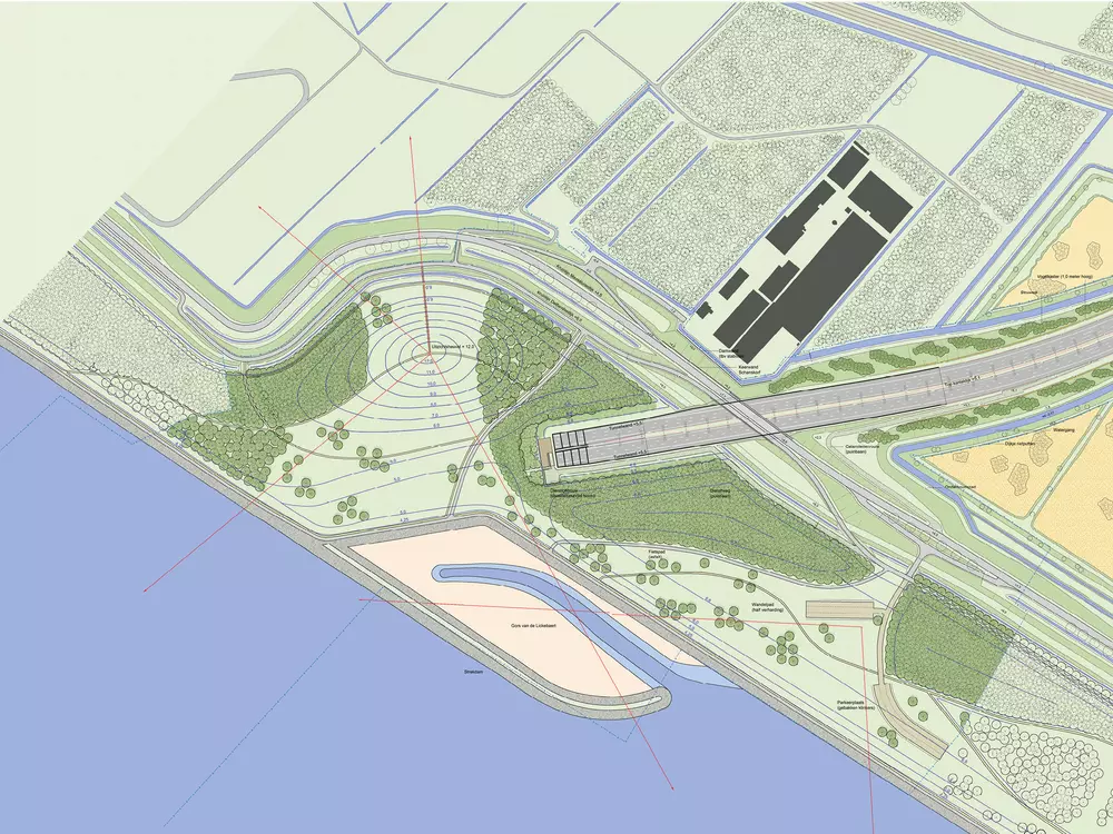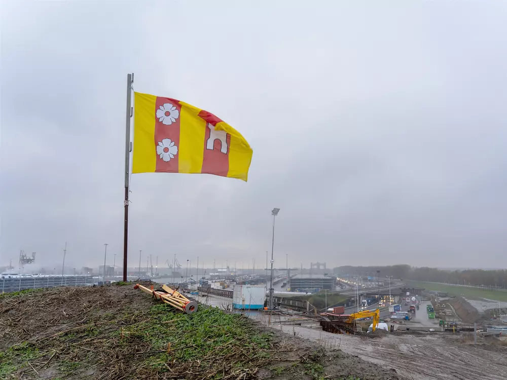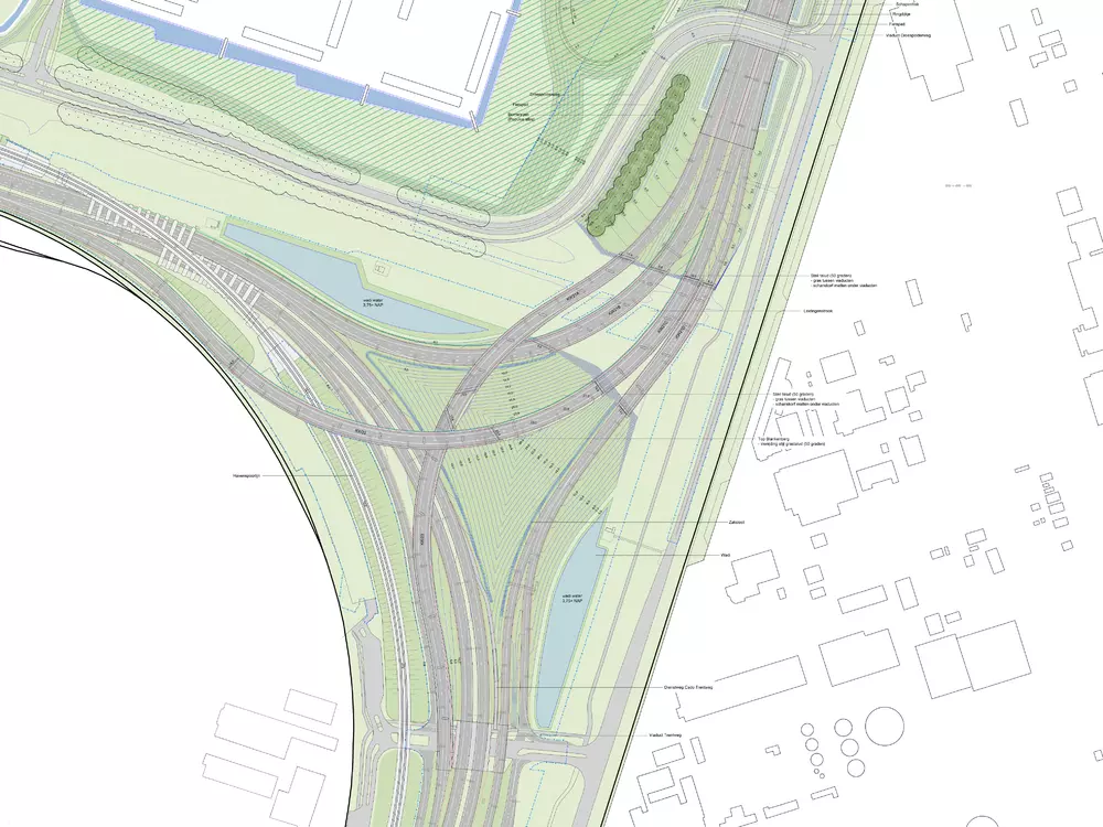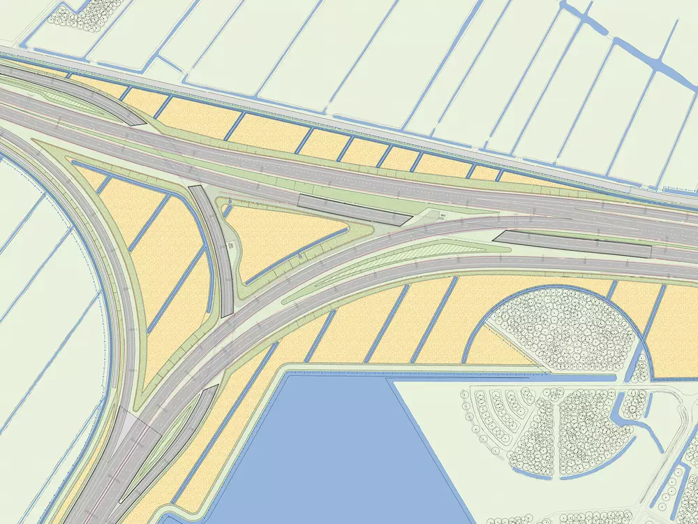 In het grootschalige havenlandschap aan de zuidzijde mag de weg zich juist manifesteren. Hier bepaalt een bloemrijke grasheuvel van circa 25 meter hoog, doorsneden door fly-overs en viaducten, het beeld. Vanaf de fly-overs is er uitzicht over het havengebied, terwijl waterinfiltratiezones aan de voet van de heuvel bijdragen aan een robuuste en duurzame inrichting.